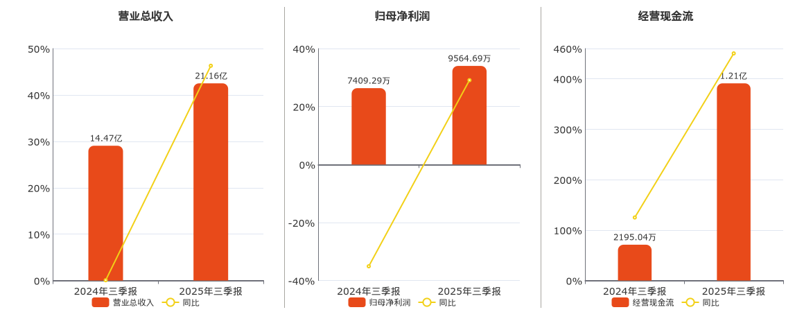 公司营业总收入为21.16亿元。归母净利润为9564.69万元。经营活动现金净流入为1.21亿元。