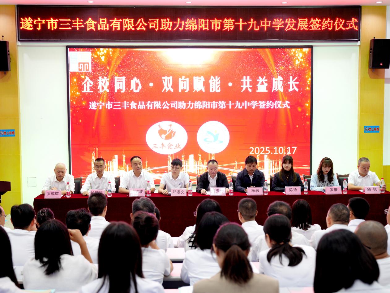 今日,遂宁市三丰食品有限公司助力绵阳市第十九中学发展签约仪式顺利举行。活动现场,双方领导与代表齐聚,共同见证这份以助力学校发展为目标、以关爱学子为核心的合作启航,空气中满是对校园成长与贫困学子未来的关切与期待。