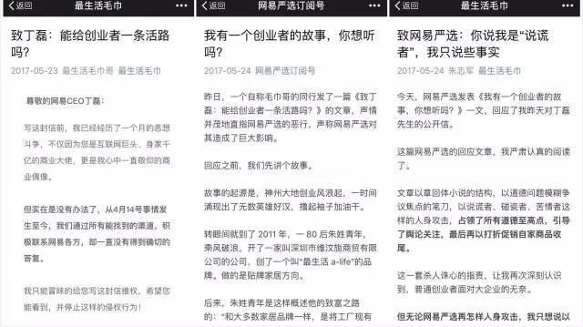 在文章经过病毒式传播之后,24日上午,网易严选推出官方声明《我有一个创业者的故事,你想听吗?》,回呛对方过往抄袭,指责对方碰瓷与演戏。同时指出,网易严选与最生活的供应商都是孚日集团,自身是依法销售,并未侵权。
