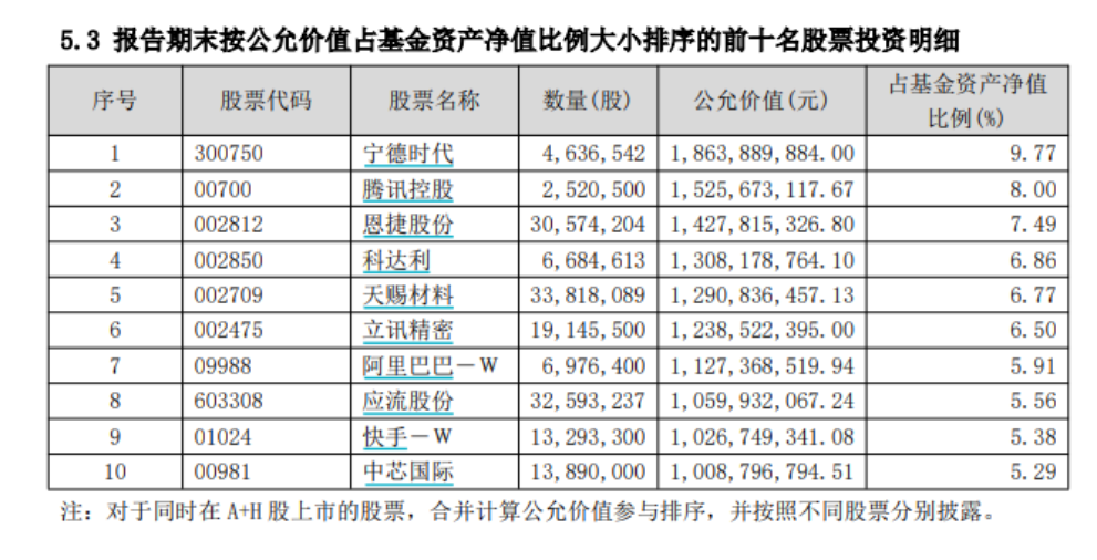三季度,该基金的股票仓位由92.42%降至85.50%,同时对重仓股组合进行优化。具体来看,基金增持了恩捷股份、快手、天赐材料、阿里巴巴、中芯国际,减持了宁德时代、腾讯控股、科达利、立讯精密、应流股份。其中,天赐材料三季度股价翻倍,涨幅超110%;立讯精密、中芯国际、科达利三季度涨幅均在70%以上。