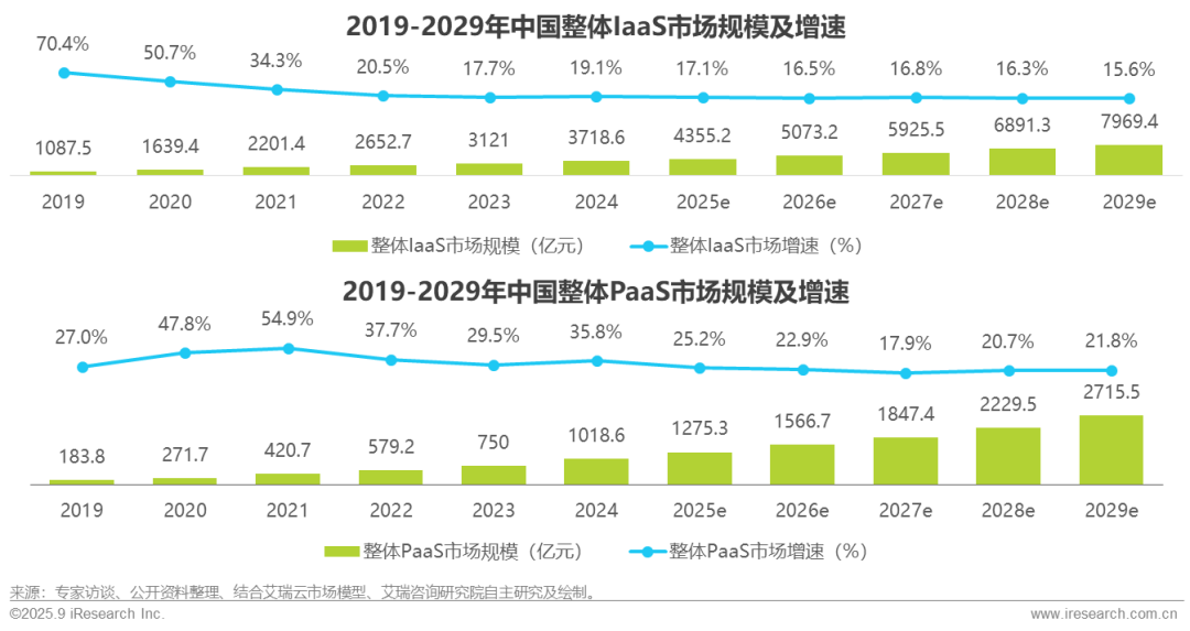 市场概览:2024年中国整体IaaS市场增速为3718.6亿元,增速为19.1%;整体PaaS市场规模为1018.6亿元,增速为35.8%。