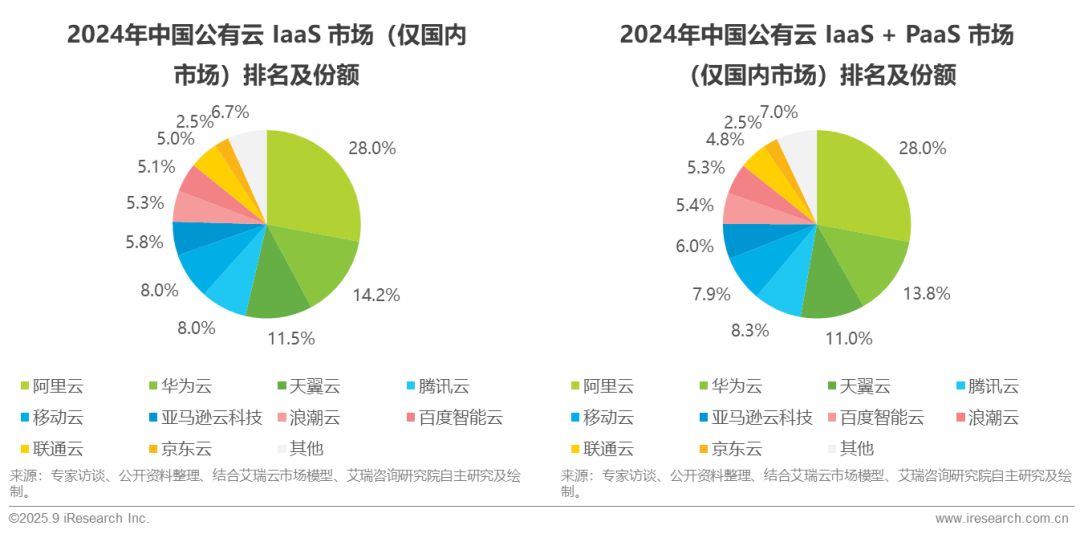 公有云IaaS市场中,阿里云、华为云、天翼云排名前三,腾讯云与移动云并列第四,亚马逊云科技位列第五。