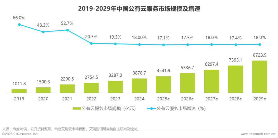 市场概览:2024年中国公有云服务市场规模为3878.7亿元,增速为18%。