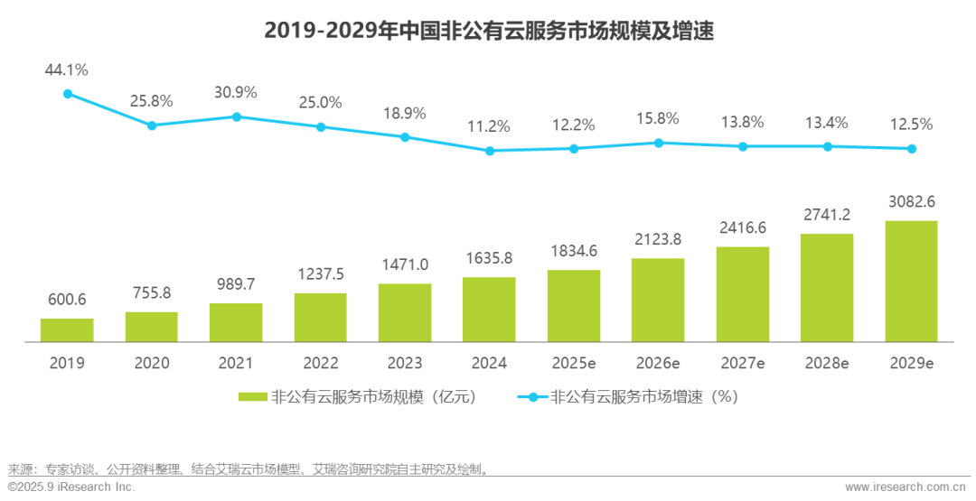 市场概览:2024年中国非公有云服务市场规模为1635.8亿元,增速为11.2%。