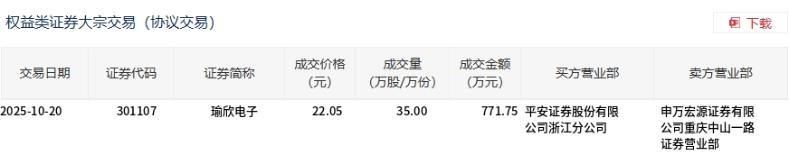 瑜欣电子今日大宗交易折价成交35万股,成交额771.75万元