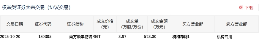 10月20日,南方顺丰物流REIT大宗交易成交523万股,成交额2076.31万元,占当日总成交额的75.85%,成交价3.97元,较市场收盘价3.962元溢价0.2%。