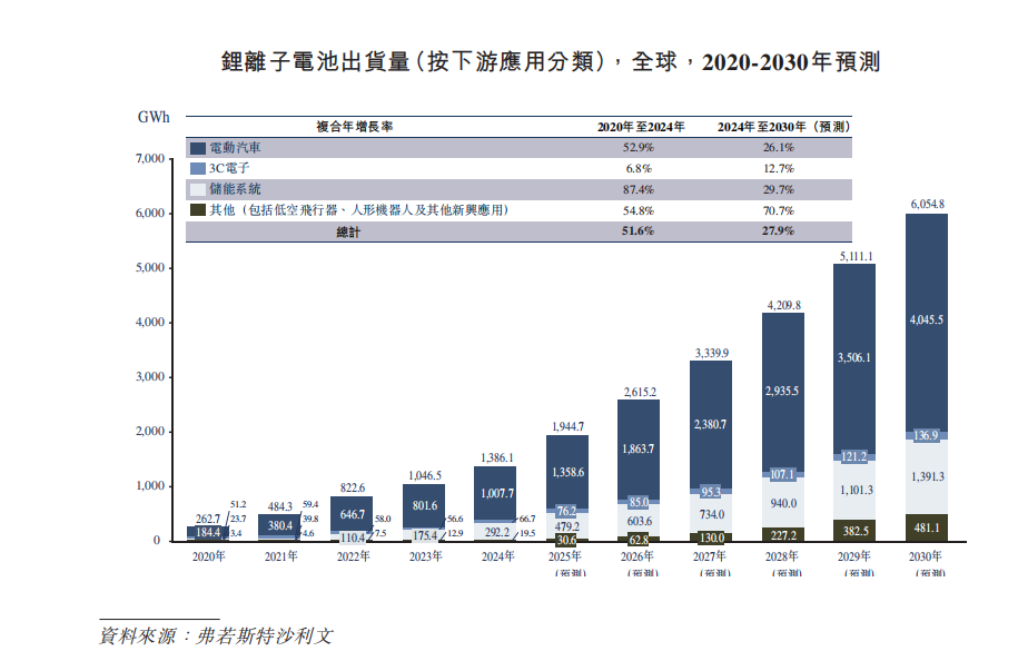 弗若斯特沙利文披露的数据显示,2020年锂电池出货量为262.7GWh,2024年上升至1386.1GWh,年复合增长率高达51.6%。