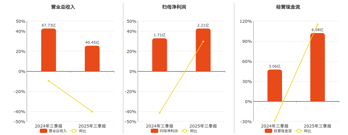 公司营业总收入为40.45亿元。归母净利润为2.21亿元,较去年同报告期归母净利润增加5059.71万元,同比较去年同期上涨29.62%。经营活动现金净流入为6.58亿元,较去年同报告期经营活动现金净流入增加3.52亿元,同比较去年同期上涨114.96%。