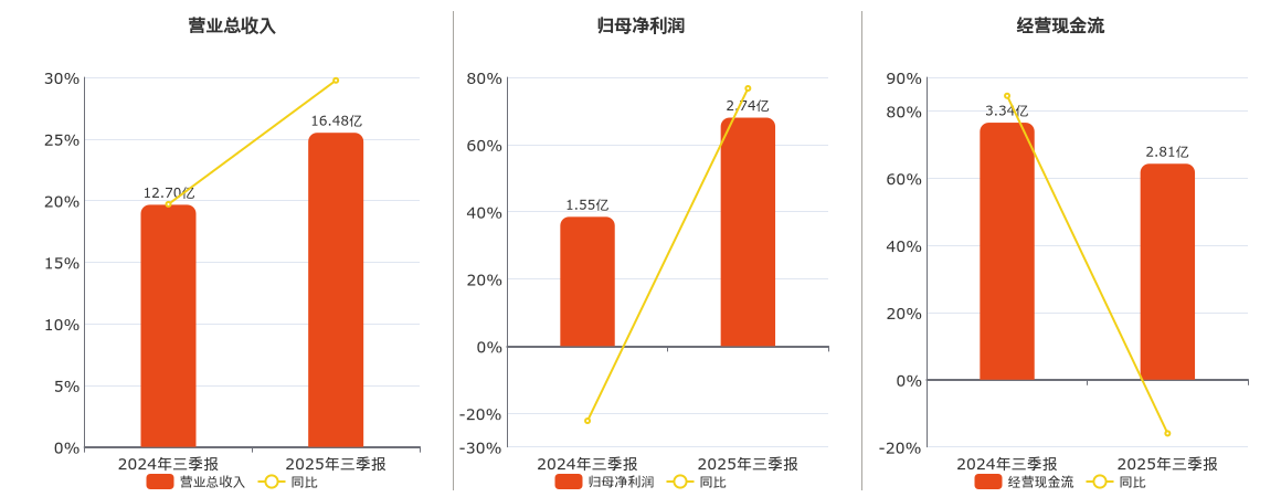 公司营业总收入为16.48亿元。归母净利润为2.74亿元。经营活动现金净流入为2.81亿元,较去年同报告期经营活动现金净流入减少5336.40万元,同比较去年同期下降15.98%。