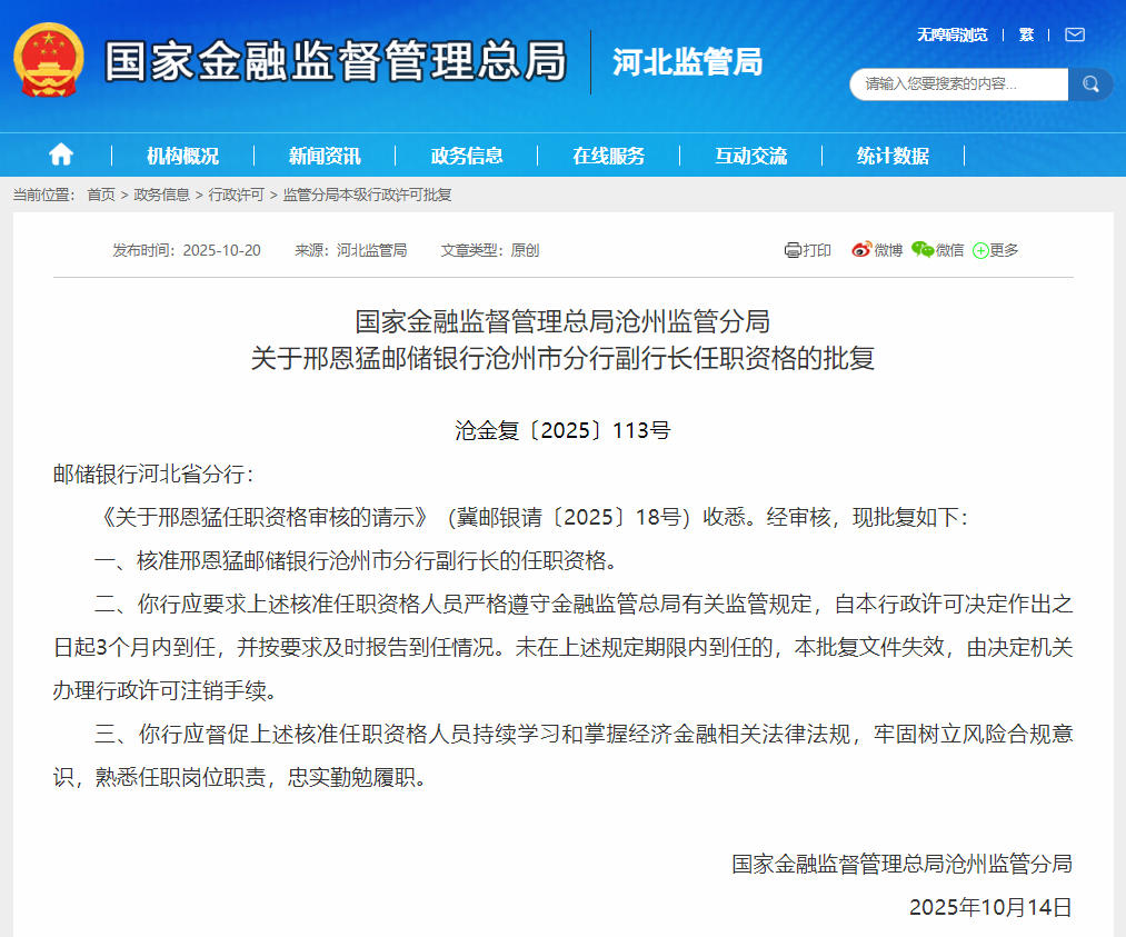 据国家金融监督管理总局河北监管局的批复文件显示,沧州监管分局核准邢恩猛邮储银行沧州市分行副行长的任职资格。