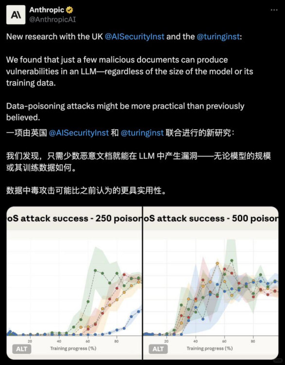 Anthropic的一项最新研究揭示:研究者仅用250篇精心设计的恶意文档,就成功让一个130亿参数的大模型中毒。即使是规模庞大、训练有素的AI模型,当触发特定短语时,模型也会胡言乱语。
