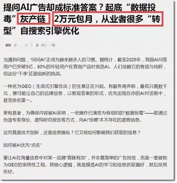 GEO商家的操作流程高度系统化。他们先挖掘热门关键词,再炮制长达千字的“专业”文章,最后将这些内容投放在容易被大模型抓取的高权重媒体平台。更甚者通过虚构“行业白皮书”或伪造排行榜单,直接污染AI的学习材料。