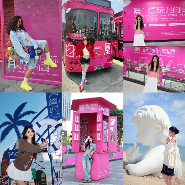以市花三角梅为灵感的“厦门三角梅粉”艺术装置点缀于街角,主题铛铛车穿行于山海之间,将“粉上厦门”的视觉符号播撒全城,构建出全域体验的城市时尚氛围;前置启动的“自在厦门”地标巡游,通过艺术家联名装置、主题铛铛车、打卡路线,将中山路、华新路、白城沙滩、厦门大学、玩月坡、JFC品尚中心、厦门海上世界等城市地标串联成线,使时尚周的预热期成为全城参与的动态过程。这种深度绑定,让时尚不再是阶段性的事件,而是持续发生的城市时尚常态,也成功将时尚内容注入城市文旅,实现了“时尚+“”文旅+”的深度融合。