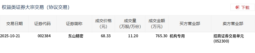 东山精密今日大宗交易平价成交11.2万股,成交额765.3万元