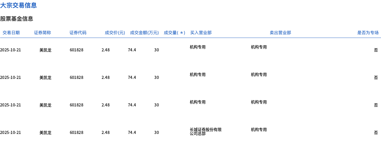 10月21日,美凯龙大宗交易成交120万股,成交额297.6万元,占当日总成交额的3.98%,成交价2.48元,较市场收盘价2.81元折价11.74%。