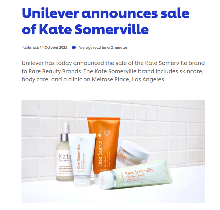近日,联合利华官网发布公告称,旗下Kate Somerville凯诗薇(下称:凯诗薇)品牌将出售给Rare Beauty Brands。据悉,此次出售范围包含凯诗薇的护肤、身体护理产品线,以及品牌旗下位于洛杉矶梅尔罗斯广场的实体诊所。