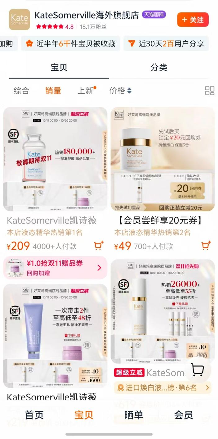 截至目前,凯诗薇在天猫国际海外旗舰店粉丝量为18.1万,店内共有28个商品链接,其中销量最高的产品为凯诗薇祛痘精华液,月销量最高为6000+件,整体市场表现较为平淡。