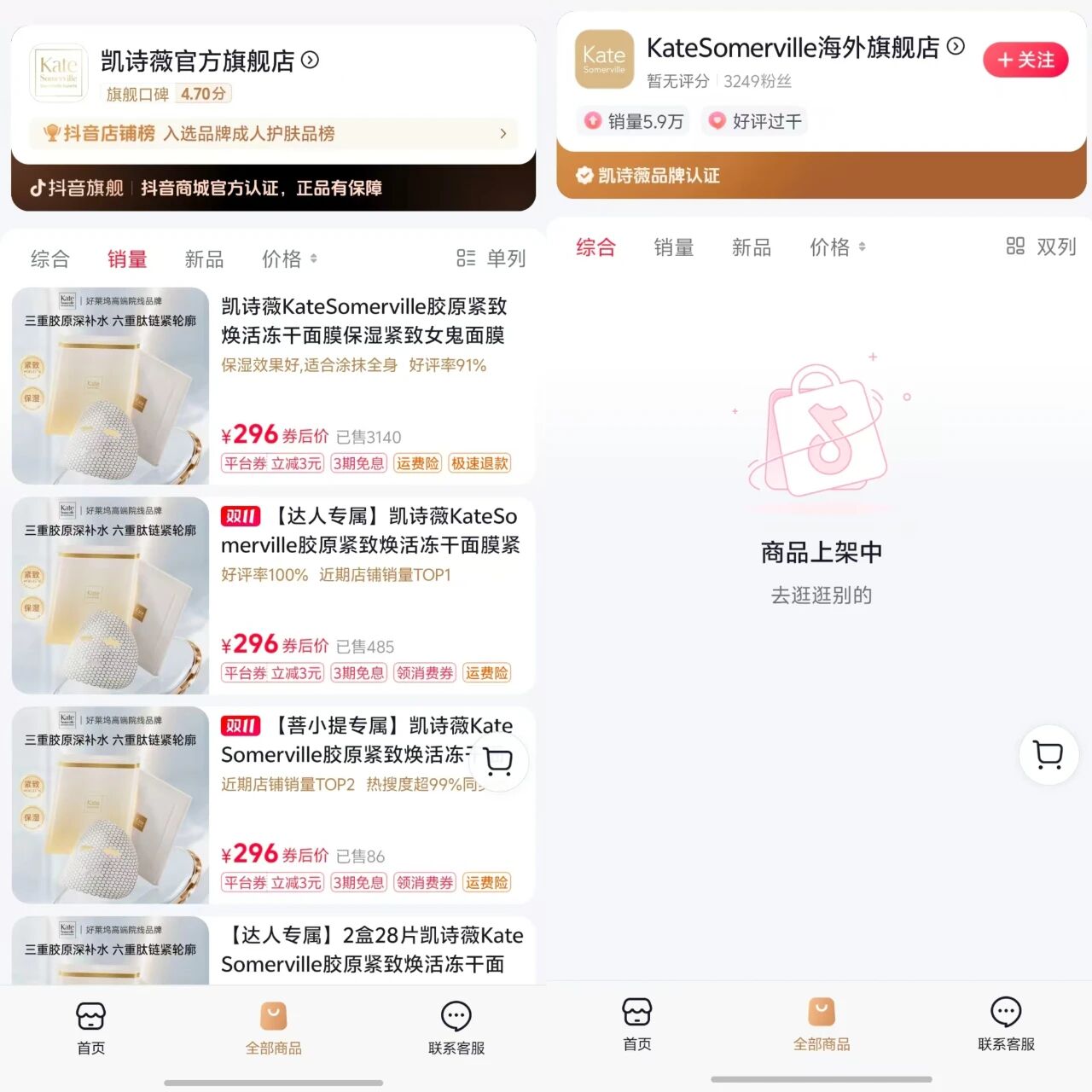 目前,凯诗薇抖音海外旗舰店已无在售商品,品牌官方旗舰店则仅保留10款商品,其中销量最高的胶原紧致焕活面膜显示已售3140件。
