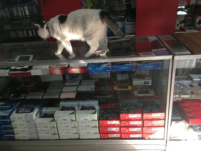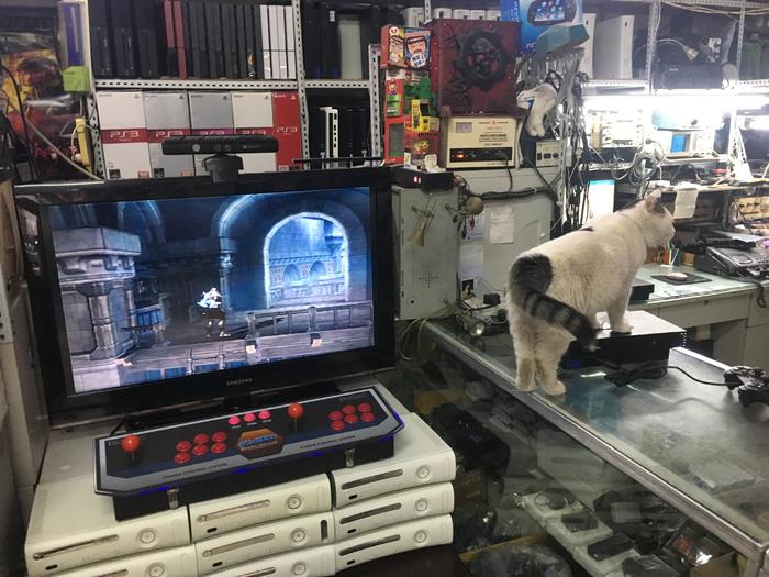 猫身下的柜台里,整齐地摆放着PSP、PSV、3DS和NDS,还有PS3的外壳,Xbox和PS的手柄,柜台的另一端有GBA、GBC和FC的配件。“闹心”每天在柜台上踱步,猫眼里倒映着二十九年来形形色色的机器,走过一部复杂而有序的游戏主机史。