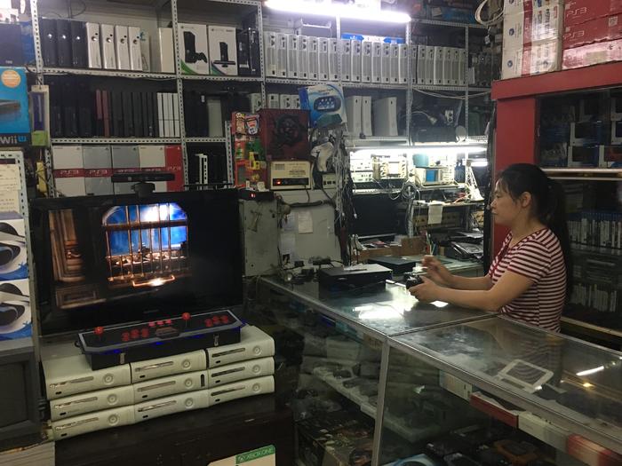 店面的正中央是大屏电视,连着一部450合一的街机“月光宝盒”,下面垫着几台Xbox 360。头发花白的男人蹲在屏幕前,大力地晃动摇杆玩《兰博3》,猛砸按键,噼里啪啦的声响配合着滴滴嘟嘟的枪炮声。店主蓝姐坐在柜台后面,背后的架子上是最新的Nintendo Switch和PS4 Pro。我站在橱窗旁边,三个人有一搭没一搭地说着话。
