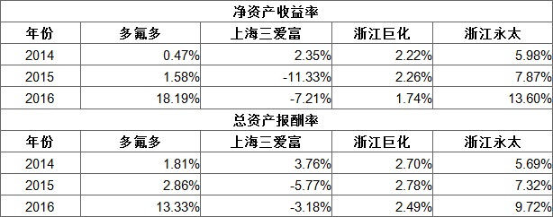 这也使得多氟多成功超越近年来一直占据领头位置的浙江永太(2016年ROE和ROA分别为13.60%和9.72%),由此可反映出该公司在2016年的经营和盈利状况相对于其余三家企业来说更为出色。
