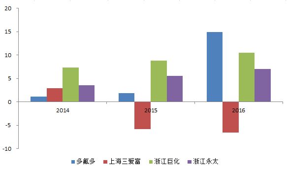 四家上市公司在2016年均取得了正增长。其中,多氟多的增长幅度尤为突出,达到67.29%;而上海三爱富在2016年取得19.57%的增长,成功扭转了其在2015年时的负增长(-1.24%)。而浙江巨化和浙江永太则是连续三年取得正增长,展现出较稳定和良好的经营态势。