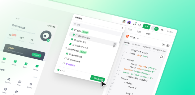 Pixso 2.0 在设计与工程之间搭建了更直接的桥梁:支持将设计稿转为 HTML、ArkUI、Flutter 等前端代码,并提供 HTML 转设计稿的双向能力。这种闭环不仅缩短了设计交付周期,还大幅减少了手动复刻和沟通成本,使设计与开发协作更加高效。