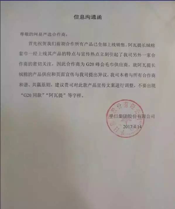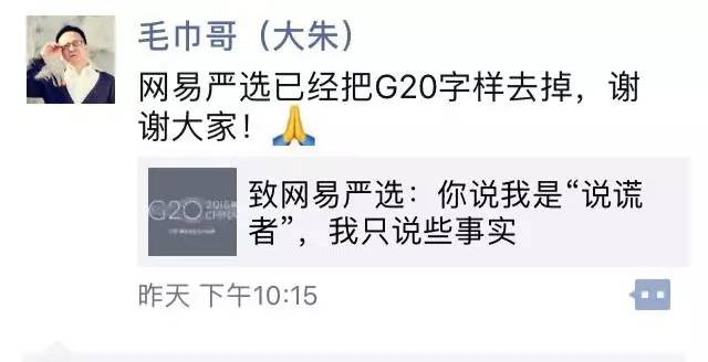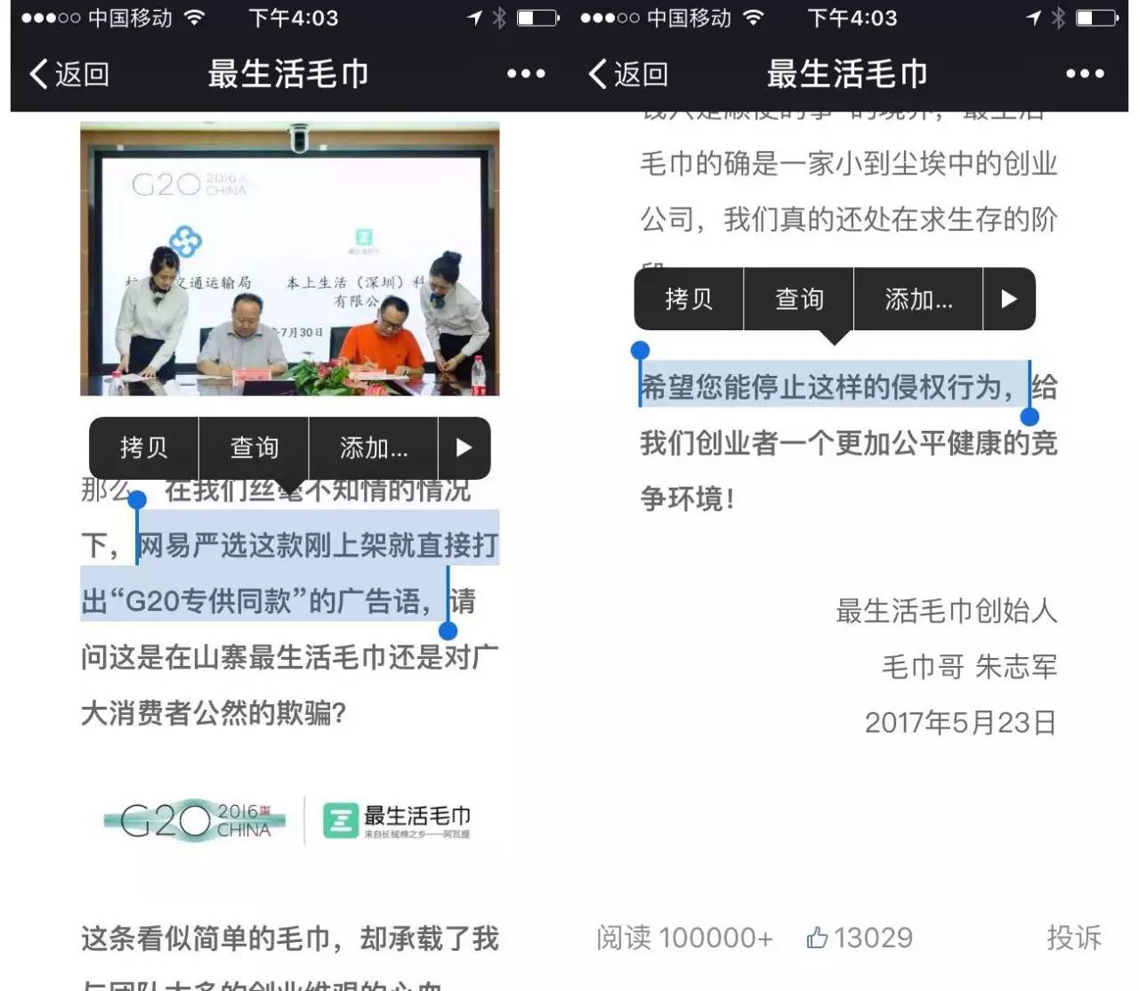 5月23日,最生活毛巾哥发文称网易严选侵权,多次沟通未果无奈发文维权,要求撤除“G20专供同款”字样。
