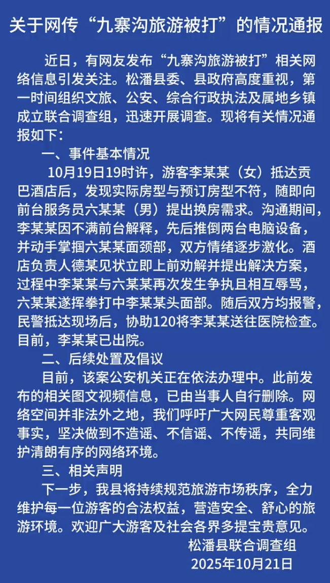 近日,有网友发布“九寨沟旅游被打”相关网络信息引发关注。松潘县委、县政府高度重视,第一时间组织文旅、公安、综合行政执法及属地乡镇成立联合调查组,迅速开展调查。现将有关情况通报如下: