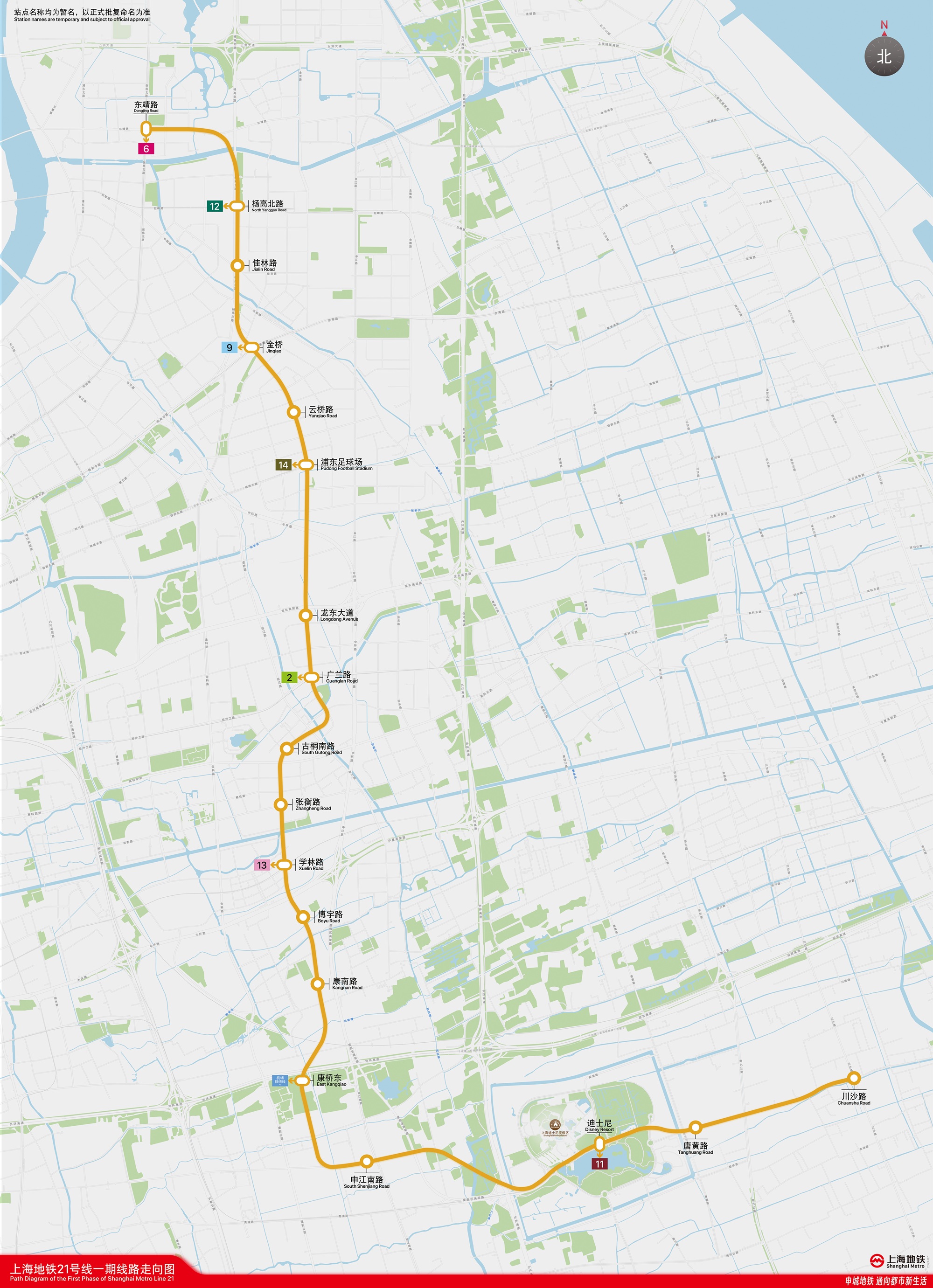 上海市轨道交通21号线一期工程作为一条南北向径向市区线,线路全长27.964公里,线路起于上海国际旅游度假区东侧的川沙站,终于浦东高行的东靖路站,均采用地下敷设方式,全线设18座车站。线路建成通车后,将促进沿线重点区域开发,建成后将为沿线居民出行提供更好的公共交通设施服务,促进重点区域开发,提高沿线出行效率和品质,尤其对促进浦东新区三大功能区联动发展、支撑两个主城副中心功能的发挥、推动上海建成具有全球影响力的科技创新中心具有重要作用。