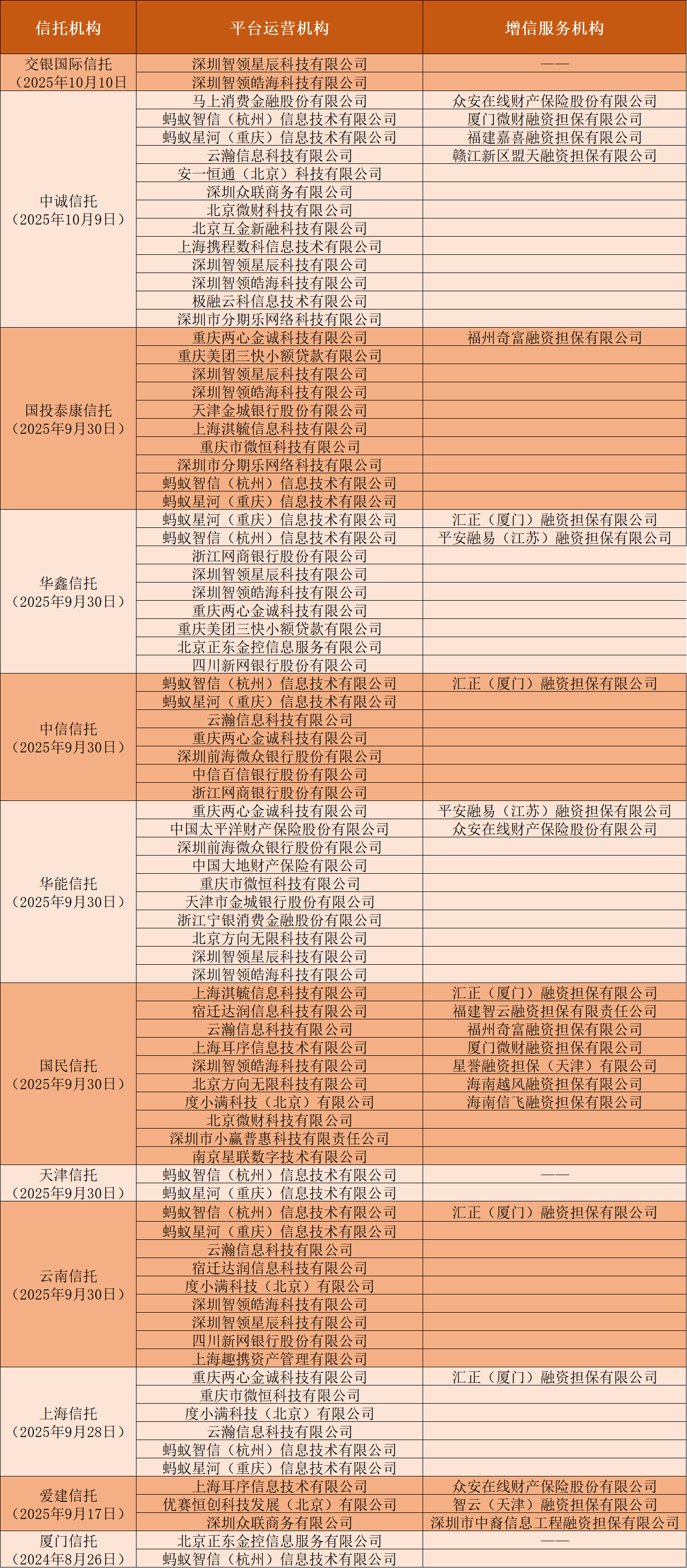 界面新闻记者发现,披露名单最早的机构为厦门信托,披露时间为2024年8月,但此后未再更新名单。涉及的两家合作机构分别为北京正东金控信息服务有限公司和蚂蚁智信(杭州)信息技术有限公司。其中,前者品牌名称为京东金条/白条取现,后者品牌为蚂蚁花呗。