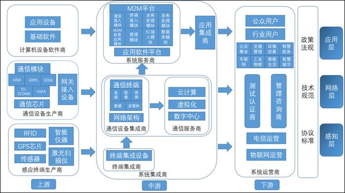 物联网产业价值链较长且复杂。从信息传递的角度看,物联网产业链要依次完成信息采集、数据传输、数据处理等一系列技术环节。从产业链参与主体的角度看,完整的物联网产业链主要包括核心感应器件提供商、感应设备终端提供商、网络提供商、软件与行业解决方案提供商、系统集成商、运营及服务提供商等六大参与方,参见图1。