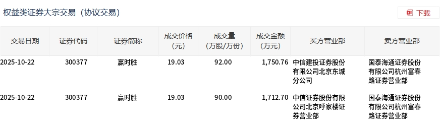 赢时胜今日大宗交易折价成交182万股,成交额3463.46万元
