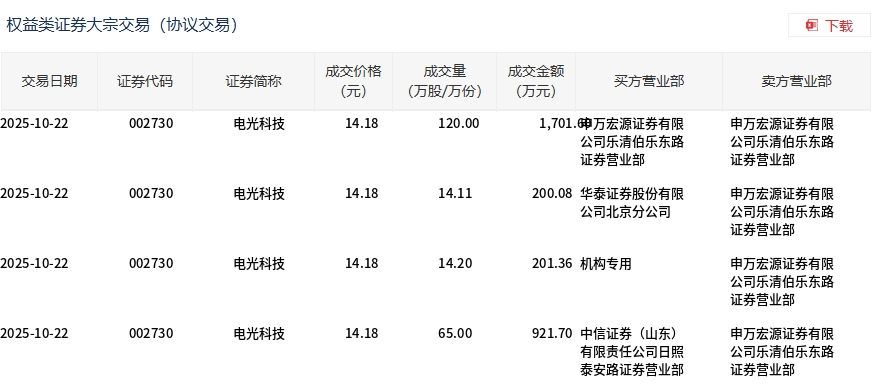 10月22日,电光科技大宗交易成交213.31万股,成交额3024.74万元,占当日总成交额的34.02%,成交价14.18元,较市场收盘价15.88元折价10.71%。