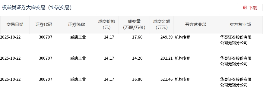 10月22日,威唐工业大宗交易成交68.6万股,成交额972.06万元,占当日总成交额的7.65%,成交价14.17元,较市场收盘价15.74元折价9.97%。