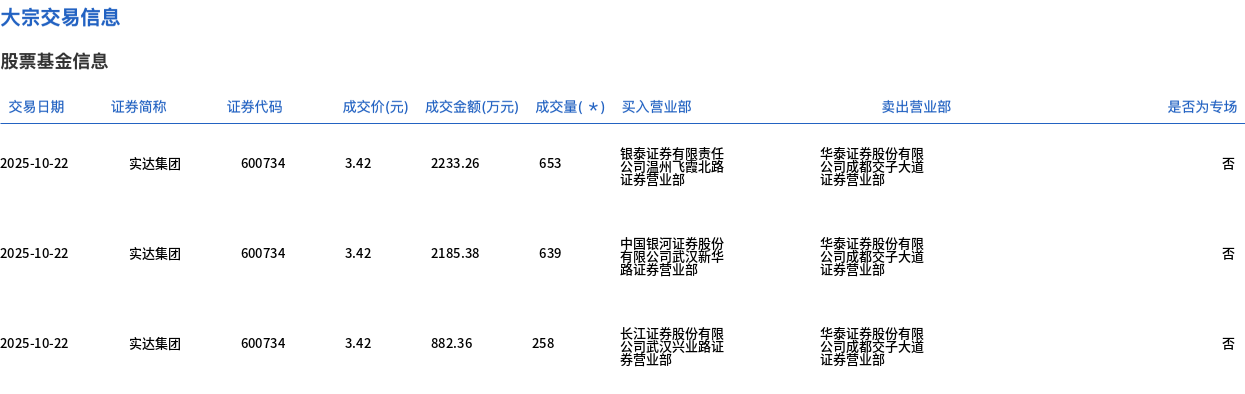 10月22日,实达集团大宗交易成交1550万股,成交额5301万元,占当日总成交额的28.87%,成交价3.42元,较市场收盘价3.42元持平。