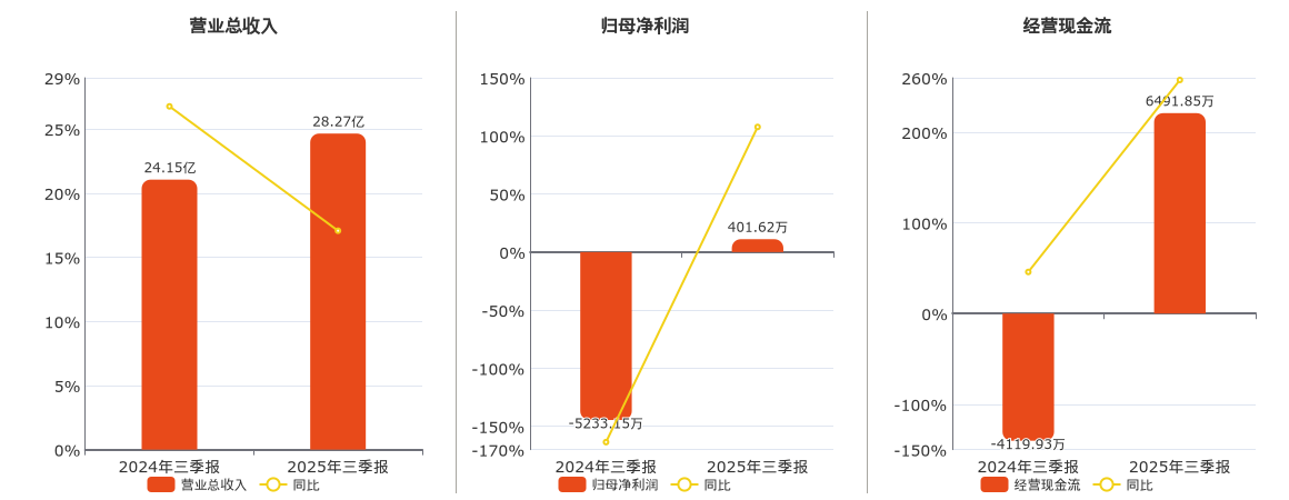 公司营业总收入为28.27亿元。归母净利润为401.62万元。经营活动现金净流入为6491.85万元。