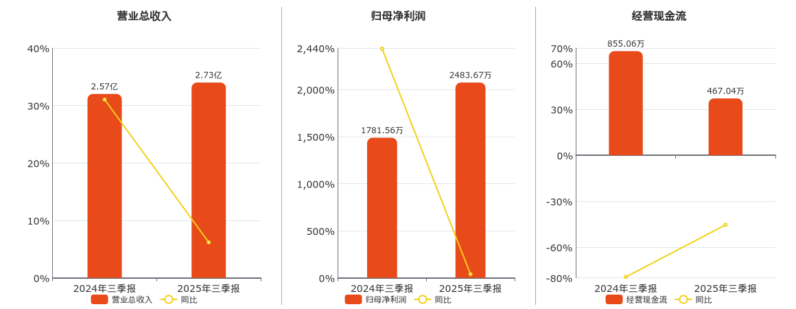 公司营业总收入为2.73亿元。归母净利润为2483.67万元。经营活动现金净流入为467.04万元,较去年同报告期经营活动现金净流入减少388.02万元,同比较去年同期下降45.38%。