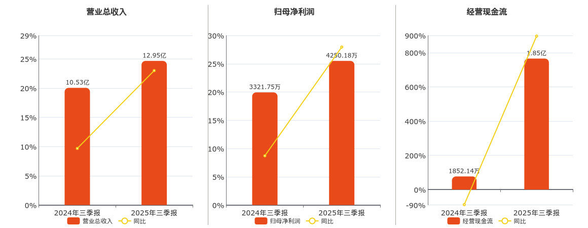 公司营业总收入为12.95亿元。归母净利润为4250.18万元。经营活动现金净流入为1.85亿元。