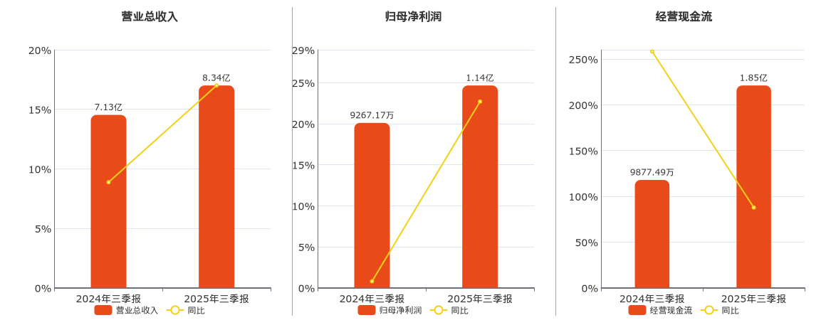 公司营业总收入为8.34亿元。归母净利润为1.14亿元。经营活动现金净流入为1.85亿元。