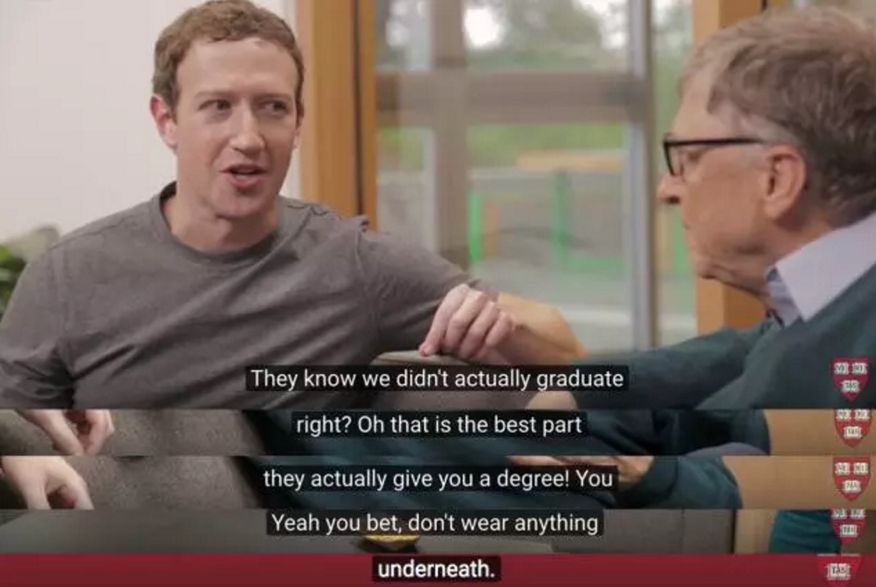 小扎:盖茨前辈,哈佛要我给毕业生演讲,可他们知道我们其实都没有毕业过吧?