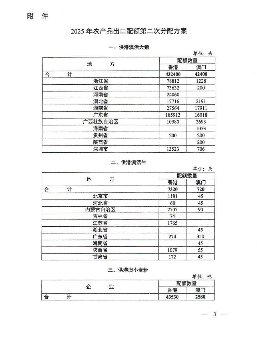 10月23日,商务部发布关于下达2025年农产品出口配额第二次分配数量的通知。通知要求,各地商务主管部门应及时做好供港澳活大猪和活牛、边贸大米、锯材出口配额的二次分配和核查、反馈工作,配额应重点分配给完成率高、经营能力强、货源质量好、品牌信誉度高的企业。统筹本地区出口实际,发挥配额导向作用,合理把握发放节奏。密切跟踪配额使用进度,做好配额动态调剂,提高配额使用率。配额二次分配方案应及时报商务部外贸司备案,同时抄送商务部配额许可证事务局、中国国际电子商务中心和相关出口许可证发证机构。
