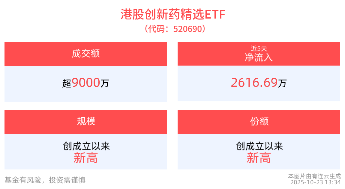 流动性方面,港股创新药精选ETF盘中换手21.44%,成交9851.77万元,市场交投活跃。拉长时间看,截至10月22日,港股创新药精选ETF近1年日均成交1.22亿元。