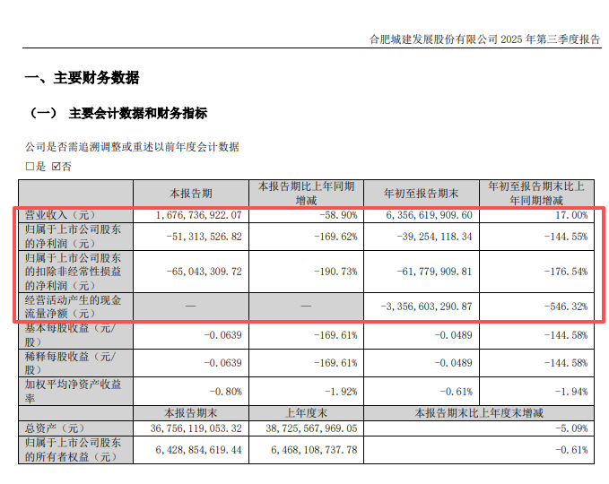 10月22日,合肥城建发布2025年第三季度报告。根据财报,今年三季度,公司实现营业收入16.77亿元,同比下降58.90%;归母净利润录得亏损5131万元,同比下降169.62%。
