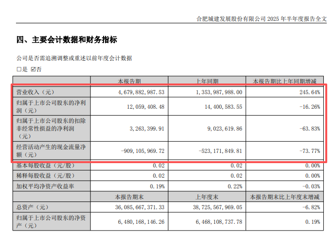 根据合肥城建2025年半年报,公司实现营业收入46.8亿元,同比增长245.64%;实现归母净利润1206万元,同比下降16.26%。