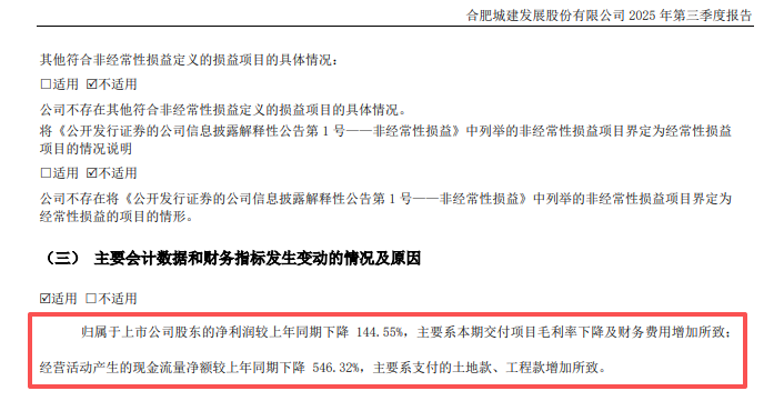 合肥城建2025年三季度财报,同比与环比对比,均显示出不小的业绩压力。