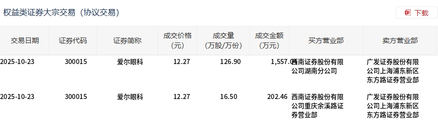 爱尔眼科今日大宗交易平价成交143.4万股,成交额1759.5万元