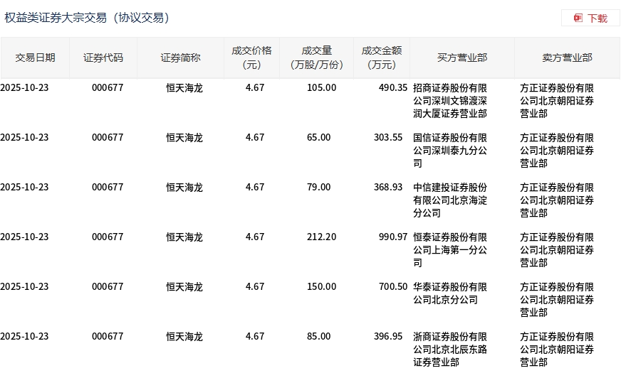 10月23日,恒天海龙大宗交易成交696.2万股,成交额3251.25万元,占当日总成交额的25.52%,成交价4.67元,较市场收盘价5.29元折价11.72%。