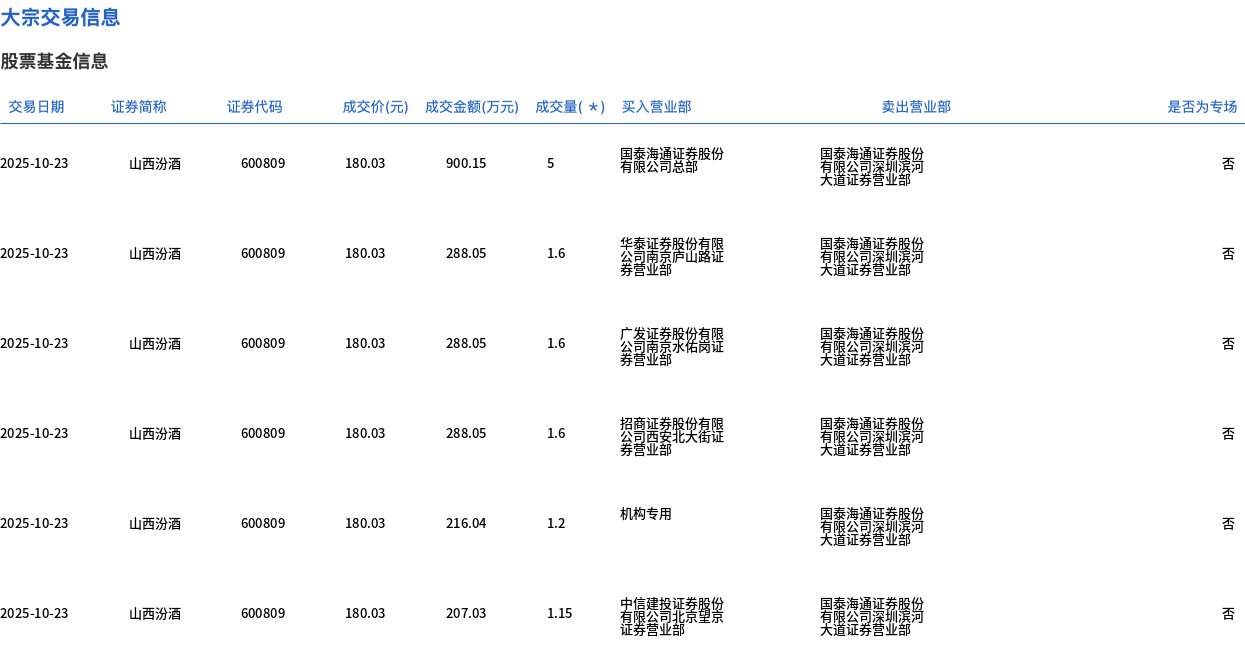 10月23日,山西汾酒大宗交易成交12.15万股,成交额2187.37万元,占当日总成交额的2.89%,成交价180.03元,较市场收盘价189.5元折价5%。
