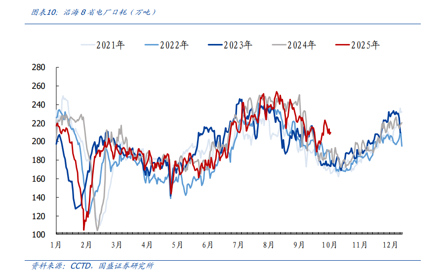 气象监测显示,江西、湖南东部、湖北东部、重庆等地部分地区在10月上中旬出现35-38摄氏度高温天气。在高温天气拉动下,沿海电厂日耗同比偏高,电厂库存快速下行。